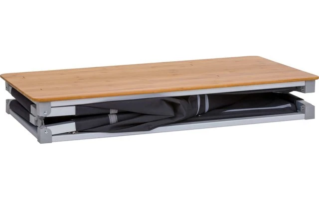 Durch die spezielle Falttechnik mit nur wenigen Handgriffen einsatzbereit. Besonders robuste, langlebige Konstruktion, die auch sehr häufigen Auf- und Abbau unbeschadet übersteht. Die Ablage ist spritzwassergeschützt, Staunässe an der Hartfaserplatte ist zu vermeiden.