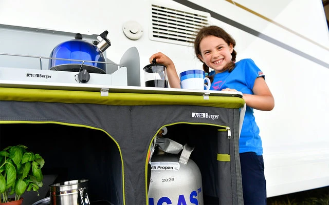Die Ablagefächer können durch den integrierten Reißverschluss geöffnet werden, damit auch größere Gegenstände (z.B. die Gasflasche) verstaut werden können. Die Küchenbox hat eine rollbare Aluminium-Arbeitsplatte mit einer abwischbaren Folienbeschichtung unter der Arbeitsfläche.